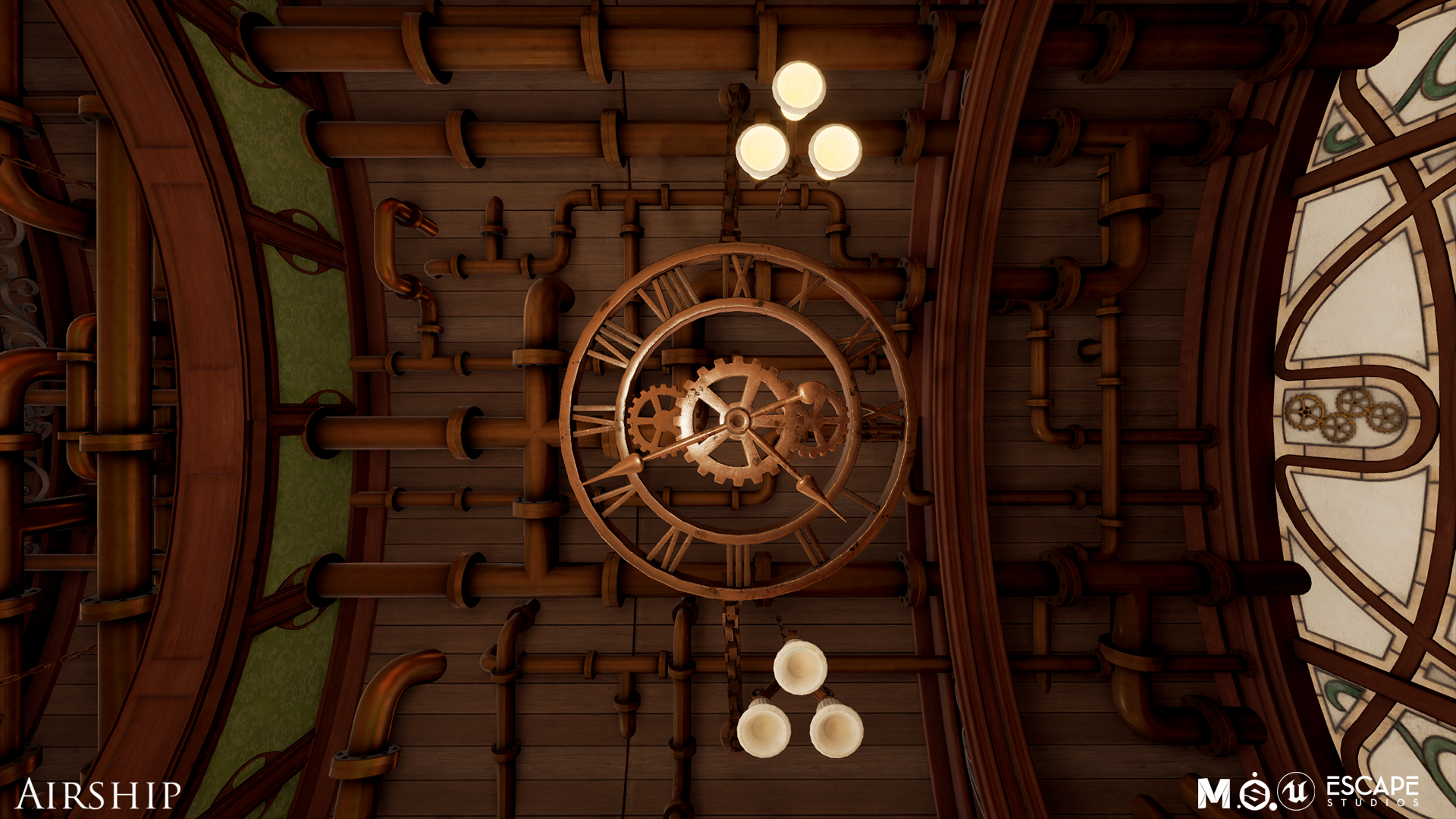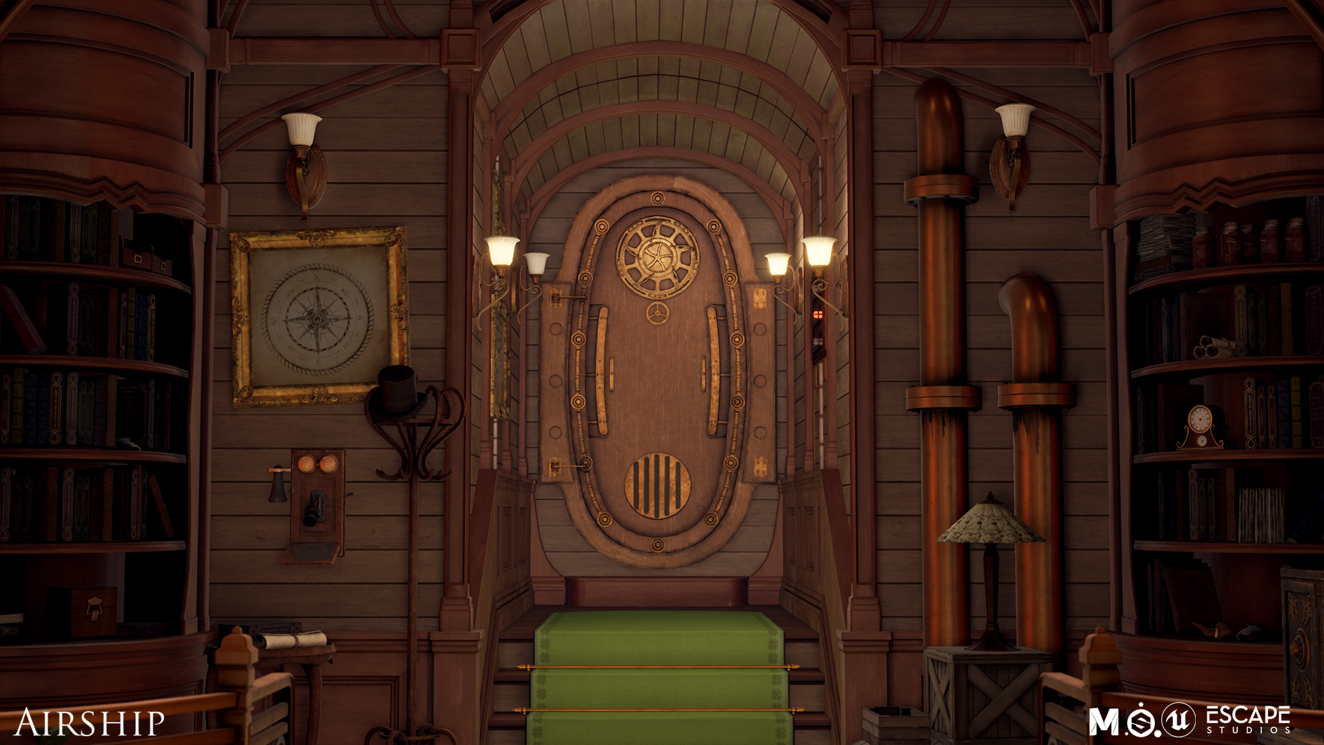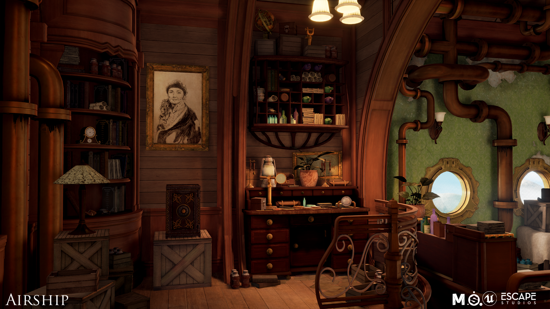 We worked really hard to try and convey the feeling that this airship belonged to someone and that it was truly lived in. Challenged with limited time, scoping this project was important, so the feeling that this project sent was very important to us. Using shape language, colour and plenty of props we spent lots of time on the details. Each book had a title. Each prop had a story. Our team fell into this storytelling and it brought passion and motivation throughout the project.